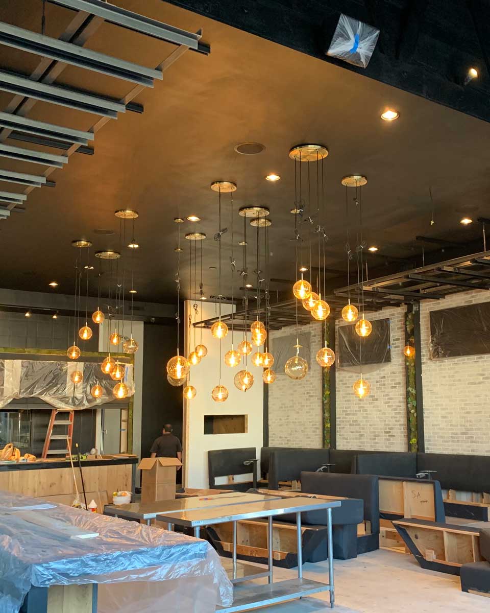 This project was a full-scale commercial interior build-out featuring custom lighting, architectural ceiling work, and integrated electrical infrastructure. Key features: • Custom pendant lighting for a warm, inviting atmosphere • Recessed and accent lighting placed for uniform illumination • Architectural ceiling fabrication with integrated lighting channels • Full electrical and low-voltage rough-in