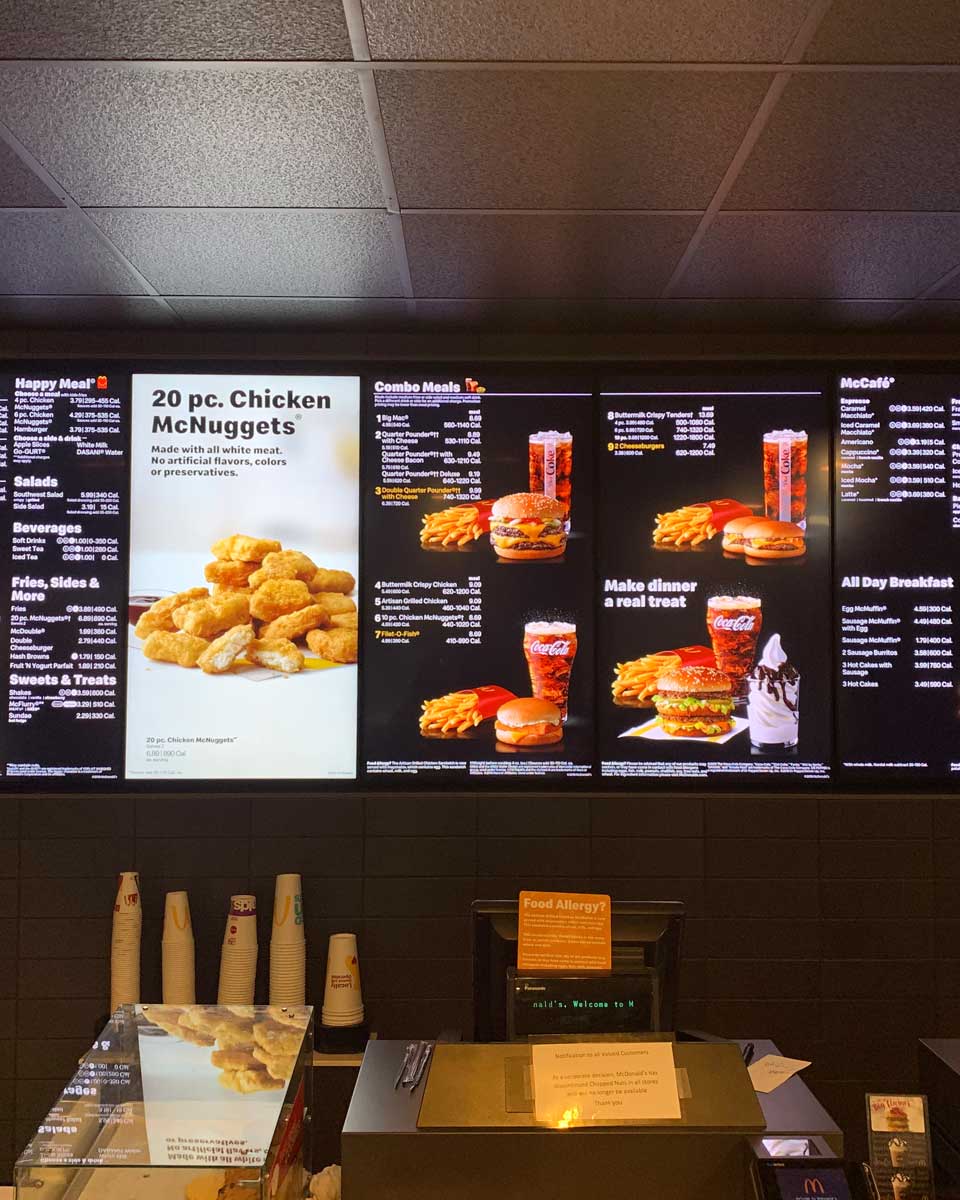 A multi-panel display installation delivers crisp visuals, vibrant food imagery, and easy-to-read pricing, ensuring customers can quickly navigate offerings and place orders efficiently. Key elements include: • Multi-screen digital menu layout • Bright, glare-resistant LED panels • Clean wall-mounted configuration with concealed wiring • Dynamic content zones for rotating specials • Optimized readability with high contrast and clear typography