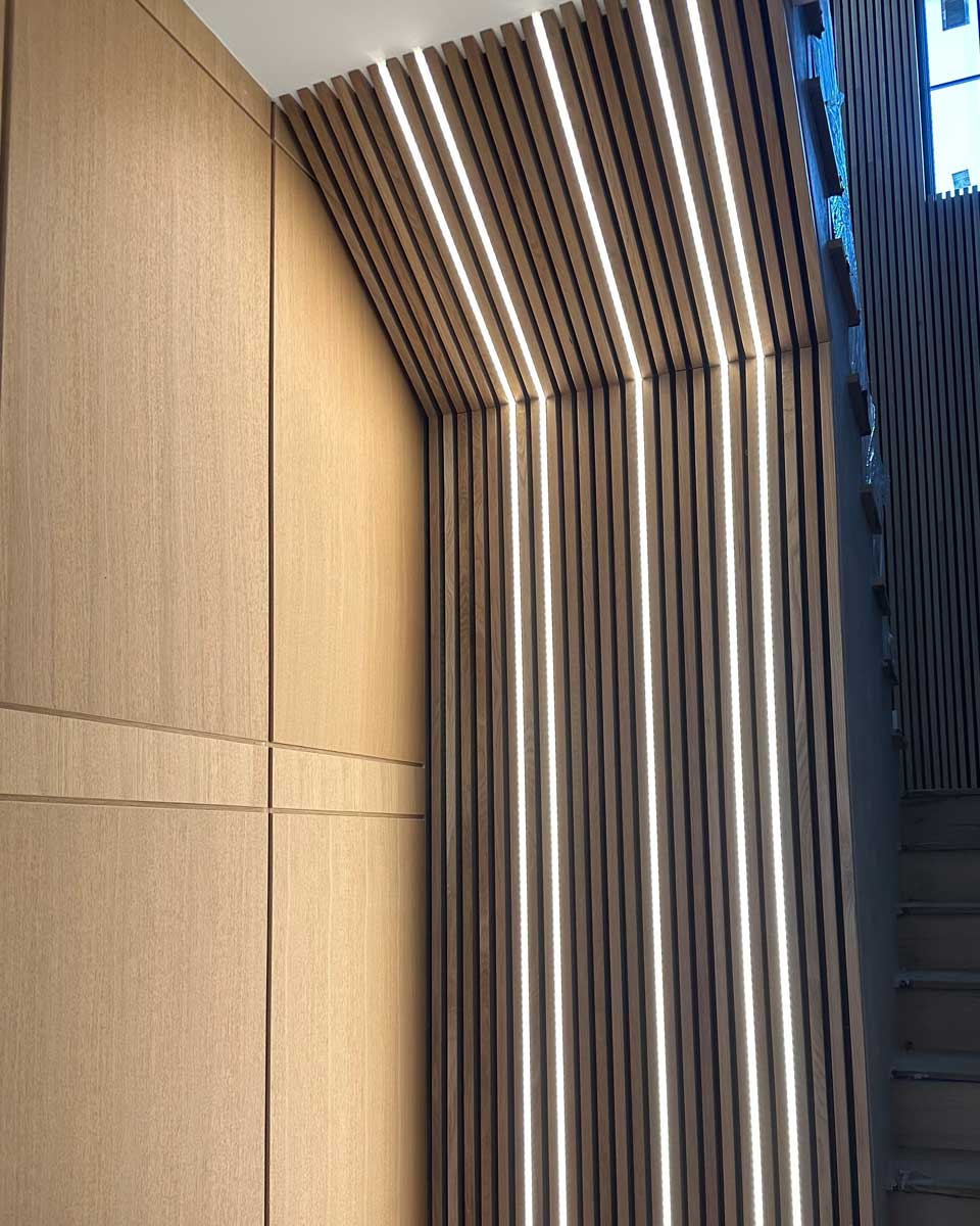 A fusion of architecture and lighting design. Vertical wood slats flow seamlessly up the wall and transition into the ceiling, with precision-embedded LED light strips that create a striking visual effect. Key elements: • Custom vertical wood slat paneling crafted for clean, continuous lines • Integrated linear LED lighting installed flush within the slats • Shadow-line design that enhances depth and architectural texture